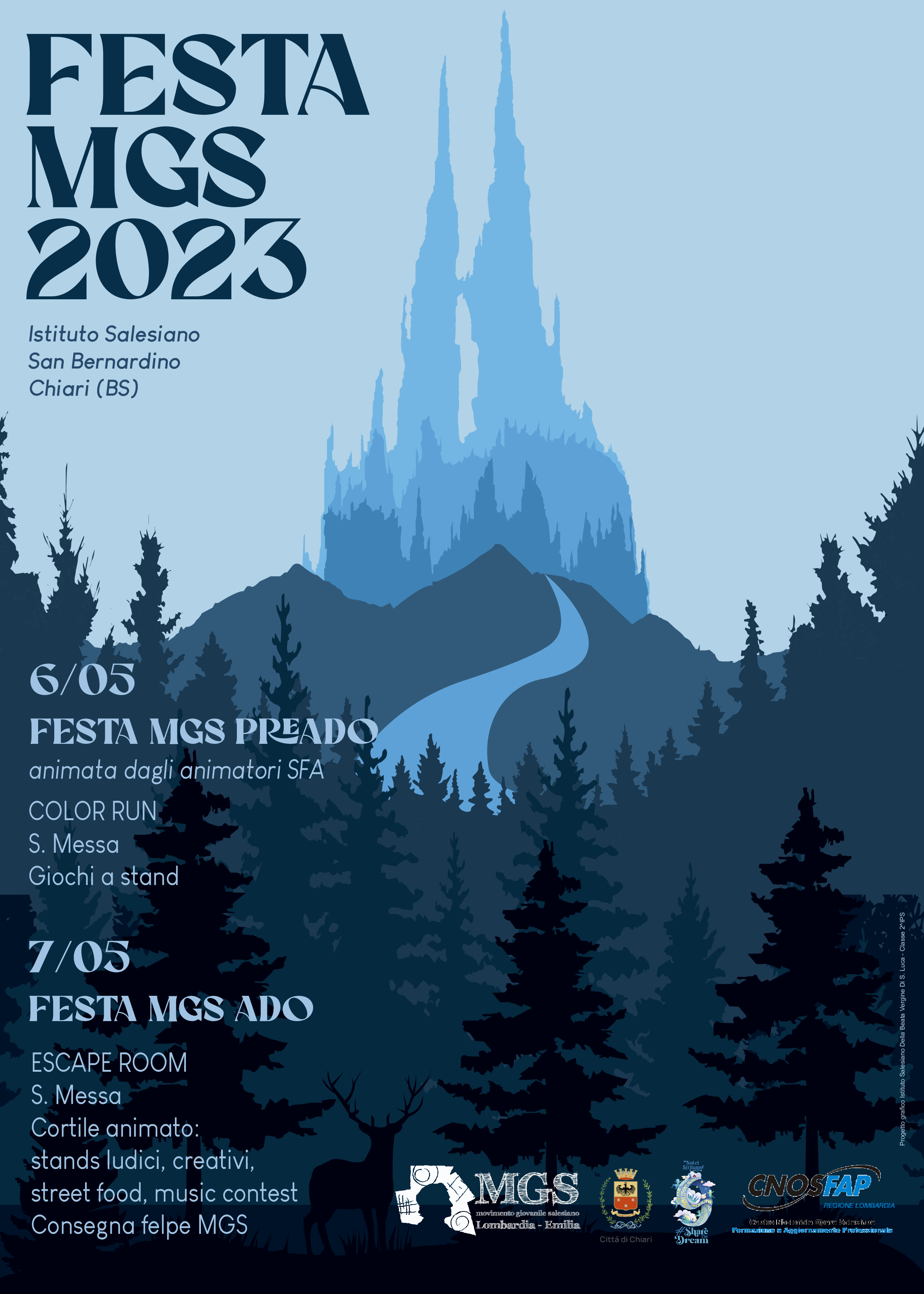 Festa MGS 2023 PREADO e ADO Chiari (BS) - 6-7 maggio 2023 Sabato 6 maggio – FESTA PREADO 09.00 Accoglienza preado e animatori SFA 10.00 Innesco teatrale gruppo teatro Chiari 10.30 COLOR RUN per le vie di Chiari per i PREADO / Gruppi di lavoro per gli animatori SFA 12.00 S. Messa 13.00 Pranzo al sacco 14.00 Giochi