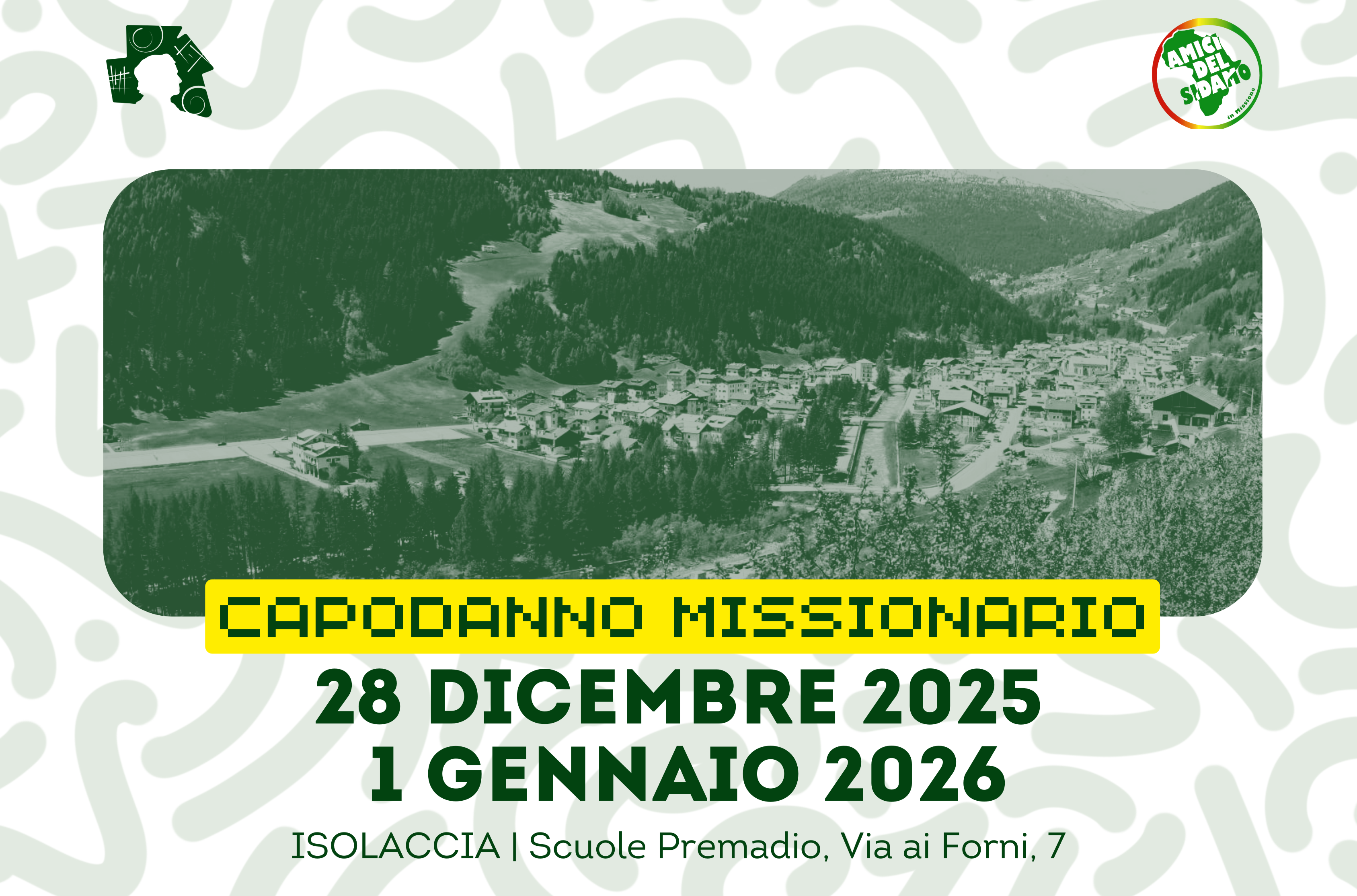 Capodanno missionario 28 dicembre 2025 - 01 gennaio 2026 ISOLACCIA - Scuole Premadio Via ai Forni, 7 In collaborazione con l'Associazione Amici del Sidamo Un capodanno diverso, di servizio in cui si svolgono diversi lavori in ristoranti e alberghi. Il ricavato sarà devoluto alle missioni salesiane in Etiopia. Indicazioni utili ritrovo domenica 28 ore 16.00 Portare pantaloni neri, camicia bianca,